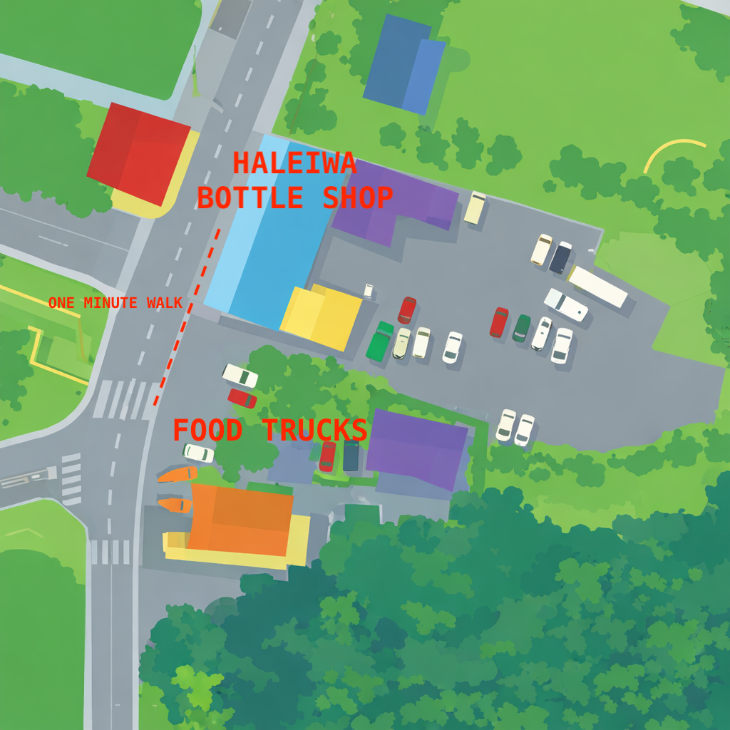 We are next to Cafe Haleiwa and across from Celestial. We are a one minute walk from Giovanni’s Shrimp Food Court. We’ll argue that—with the smallest of hustle—your food won’t get cold walking to us.